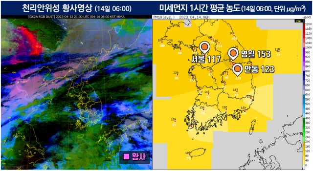 이날 오전 6시 현재 중부지방과 경북 일부 지역에서 황사가 관측돼 미세먼지 농도가 높게 나타나고 있다. 황사는 오전까지 영향을 주고 오후부터 강수와 원활한 대기 순환의 영향으로 점차 해소될 것으로 예상된다.