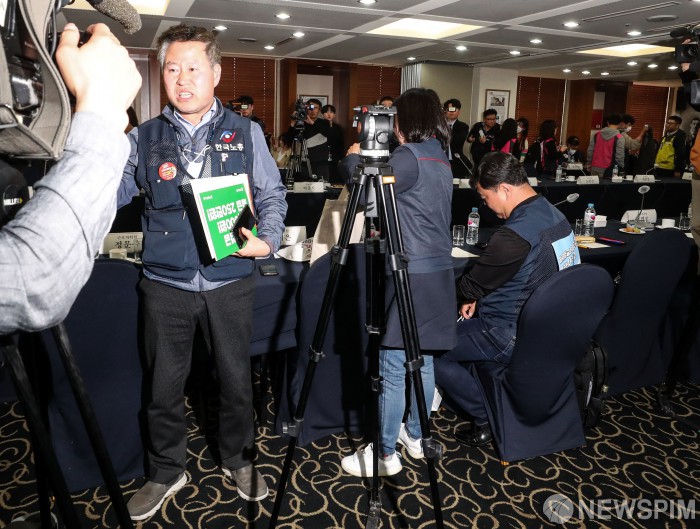 [서울=뉴스핌] 김보나 인턴기자 = 18일 오후 서울 중구 한국프레스센터에서 열린 최저임금위원회 제1차 전원회의가 파행되자 양대노총 관계자 등이 회의장을 나서고 있다. 2023.04.18 anob24@newspim.com