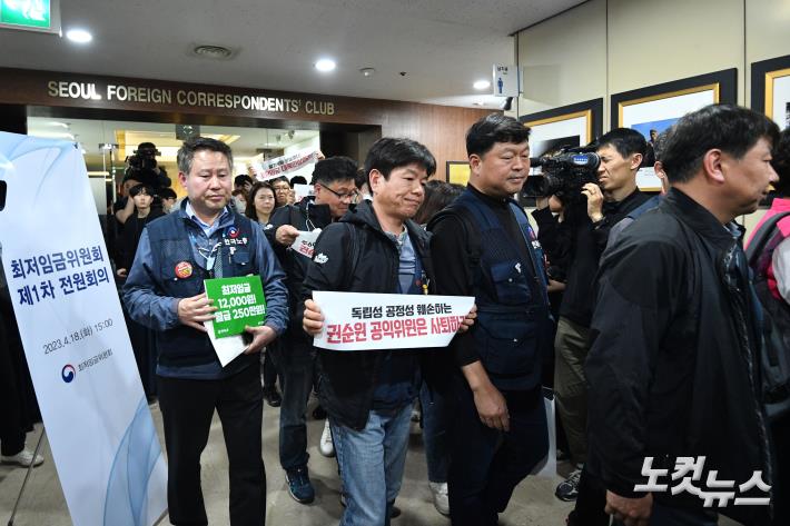 18일 오후 서울 프레스센터에서 열릴 예정이었던 최저임금위원회 제1차 전원회의가 박준식 최저임금위원회 위원장 등 공익위원들이 회의에 참석하지 않아 파행된 후 근로자 위원들이 퇴장하고 있다.