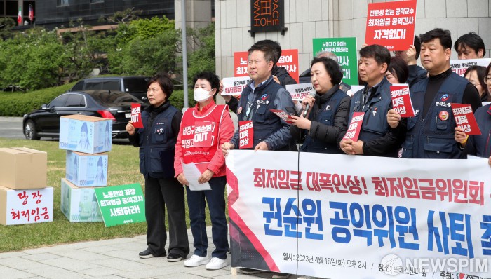 [서울=뉴스핌] 김보나 인턴기자 = 18일 오후 서울 중구 한국프레스센터 앞에서 열린 권순원 최저임금위 공익위원 사퇴 촉구 기자회견에서 양대노총 조합원들이 피켓을 들고 있다. 2023.04.18 anob24@newspim.com