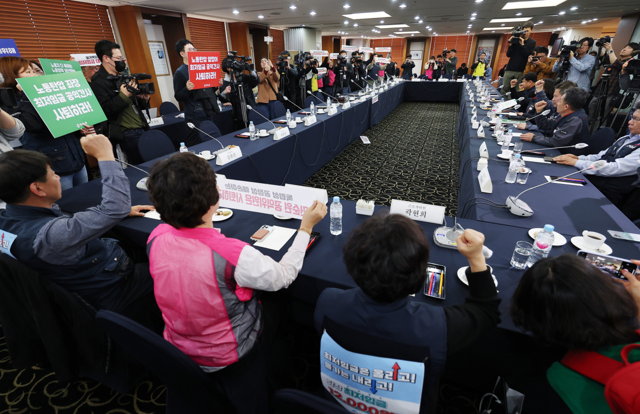 지난 18일 서울 중구 한국프레스센터에서 최저임금위원회 제1차 전원회의가 파행, 근로자위원 등 참석자들이 구호를 외치고 있다. [연합] |