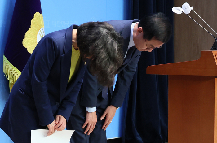 불어민주당 초선의원 모임(더민초) 윤영덕 운영위원장과 강민정 의원이 19일 오후 국회 소통관에서 기자회견을 열고 ‘돈봉투’ 의혹과 관련해 송영길 전 대표의 귀국을 촉구하는 성명서를 발표한 뒤 머리숙여 인사하고 있다. 연합뉴스 |