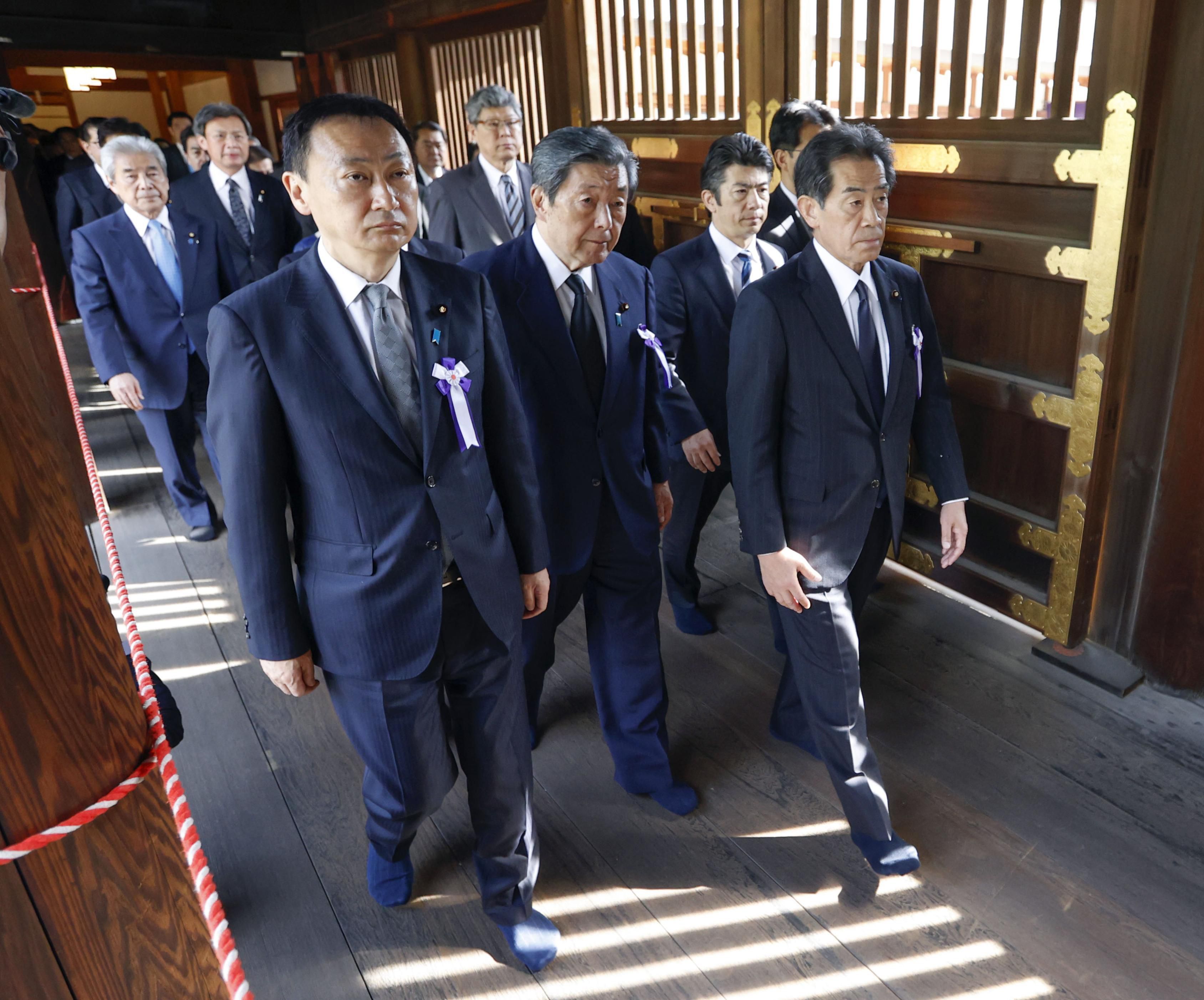 일본 자민당의 아이사와 이치로 의원(오른쪽) 등 '다함께 야스쿠니 신사에 참배하는 국회의원 모임' 소속 국회의원들이 21일 야스쿠니신사 집단참배에 나서고 있다. /연합뉴스 |