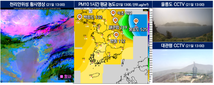 왼쪽부터 천리안위성의 황사 영상, 미세먼지(PM10) 1시간 평균농도, 울릉도와 대관령의 폐쇄회로(CC)TV 현황. 기상청 제공. |