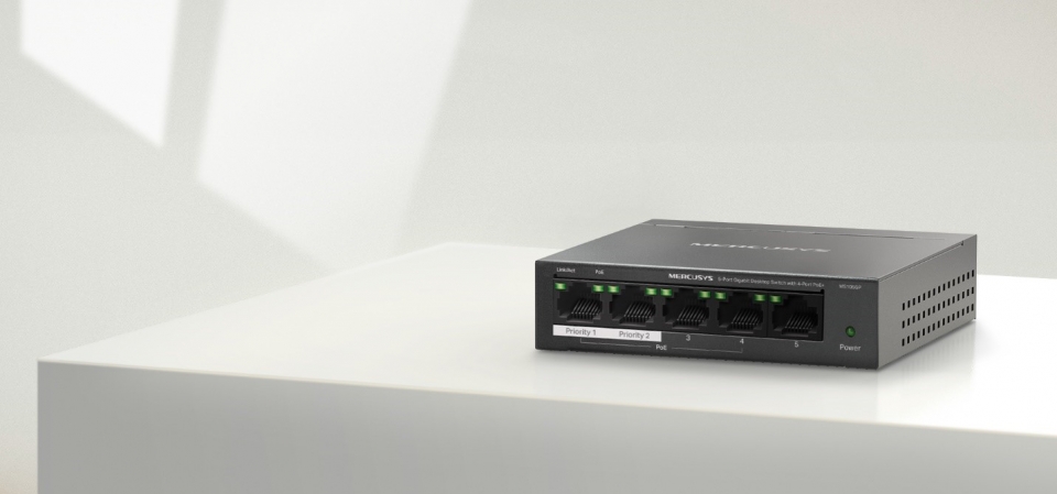 머큐시스 'MS105GP'는 5개의 10/100/1000 Mbps RJ45의 풀 기가비트 포트를 지원하는 데스크톱 스위치로 4개의 PoE+ 포트를 통해 단일 케이블에서 데이터 및 전력을 공급한다. 또한 확장 모드를 통해 최대 250m의 PoE 전송 거리를 커버하여 멀리 설치된 보안 감시 카메라에 적합하다.