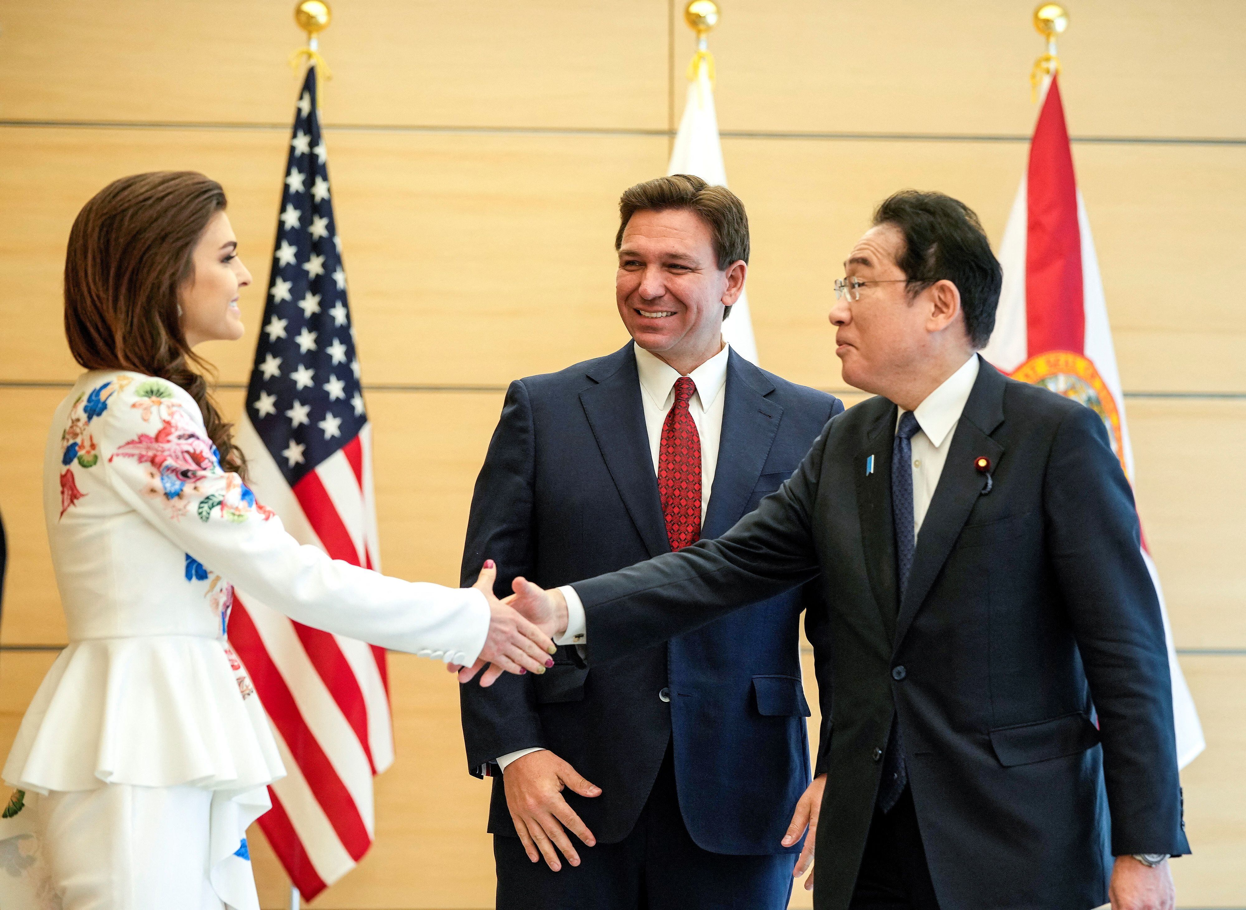 美 대선주자 디샌티스 만난 기시다 - 24일 일본 도쿄 총리 공관에서 론 디샌티스(가운데) 미국 플로리다 주지사가 기시다 후미오(오른쪽) 일본 총리와 악수하는 아내 케이시 여사 쪽을 바라보고 있다. 디샌티스 주지사는 미 공화당의 차기 대선 주자 중 한 명으로 꼽힌다. 23일 열린 일본 보궐선거에서 집권 자민당이 5석 가운데 4석을 얻으면서, 집권 3년 차인 기시다 총리가 ‘중의원 해산’ 승부수를 통해 장기 집권 기반을 닦을 가능성이 일본 정치권에서 제기됐다. /로이터 뉴스1 |