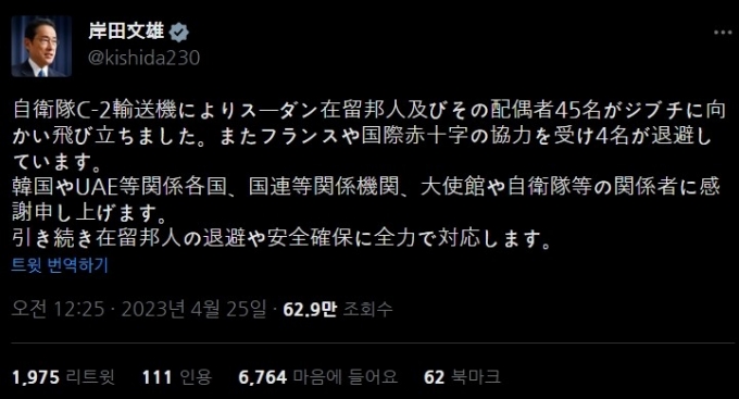 세계 각국 정부가 군벌 세력 간 무력 충돌이 격화된 아프리카 수단에서 자국민 구출 작전에 나선 가운데 일본 정부가 현지에 체류 중인 일본인 대피 작전 성공을 알렸다. 특히 기시다 후미오 일본 총리는 자국민 대피 소식을 알리며 한국 정부 등에 감사 인사를 전하기도 했다.