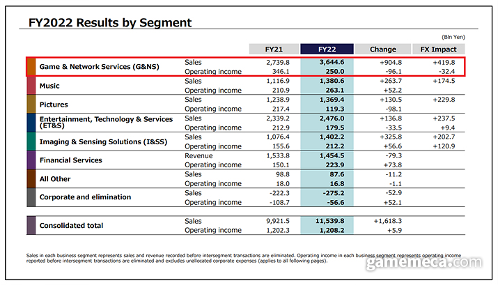 ▲ 2022년도 소니 실적, 붉은 부분이 게임 부문 (자료출처: 소니 IR) |