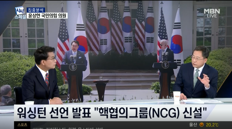 이번 한미정상회담에서 채택된 '워싱턴 선언'을 두고 '핵 공유 논란'이 일고 있는 것과 관련해 윤 의원은 "레토릭(수사적) 차원의 문제다"고 일축했습니다.