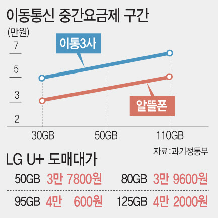 현재 통신사에서 한 달에 데이터 50GB를 쓰려면 월 6만3000원 정도를 내야 한다. 하지만, 알뜰폰에선 4만3000원이면 가능하다. LG유플러스가 이달부터 인스코비(프리티)·에넥스텔레콤(A모바일) ·마블스튜디오(마블링)·코드모바일·CK커뮤스트리(슈가모바일)·큰사람커넥트(이야기모바일)·와이엘랜드(여유텔레콤)·유니컴즈·미디어로그(U+유모바일) ·LG헬로비전(헬로모바일) 등 자사 망을 쓰는 알뜰폰 회사에 5G 중간요금제 도매제공을 시작했기 때문이다.