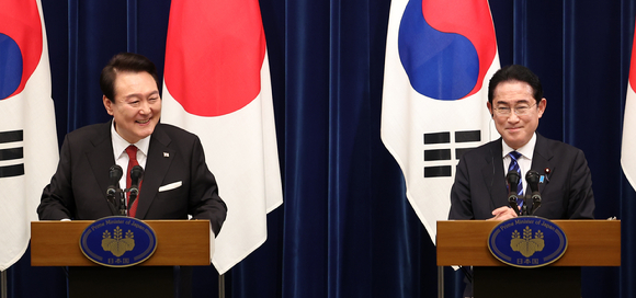 윤석열 대통령과 기시다 후미오 일본 총리가 지난 3월 도쿄 총리 관저에서 열린 한일 정상회담을 마친 후 공동 기자회견을 하고 있다. [사진=뉴시스] |