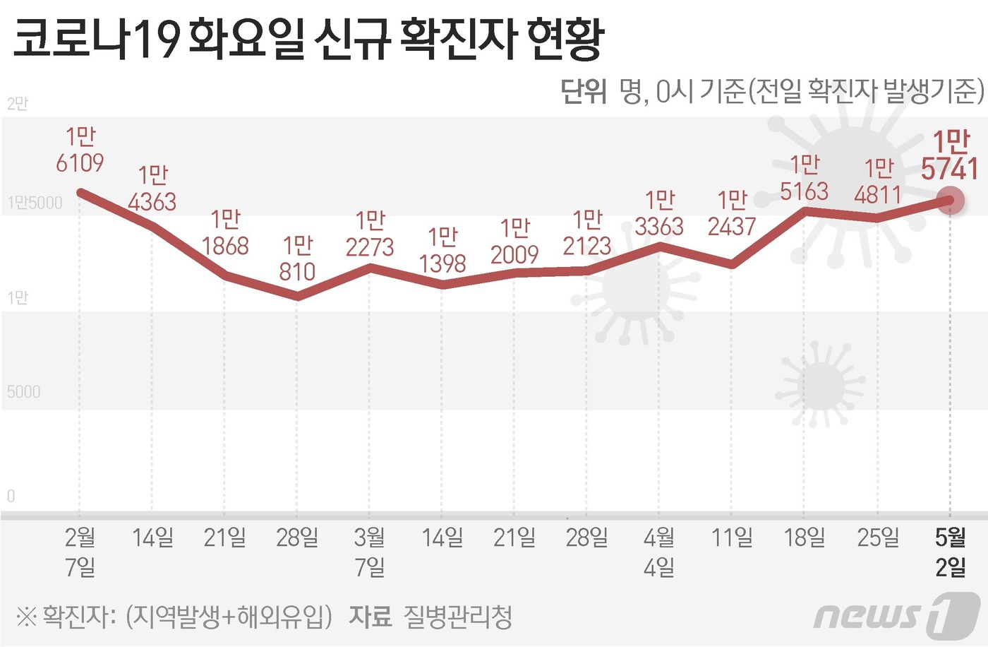 (서울=뉴스1) 양혜림 디자이너 = 질병관리청 중앙방역대책본부(방대본)는 2일 0시 기준 신종 코로나바이러스 감염증(코로나19) 신규 확진자가 1만5741명 발생했다고 밝혔다.