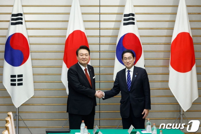 일본을 방문한 윤석열 대통령이 3월 16일 오후 일본 도쿄 총리 관저에서 기시다 후미오 일본 총리와 한일 확대정상회담에 앞서 기념촬영을 하며 악수하고 있다. /AFPBBNews=뉴스1 |