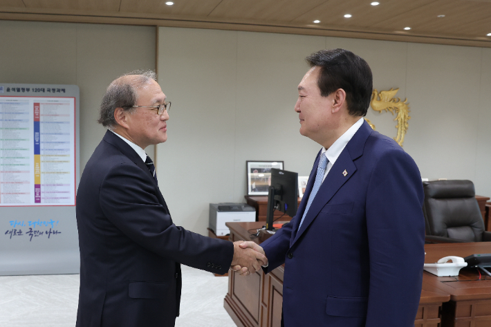 윤석열 대통령이 3일 서울 용산 대통령실 청사에서 한일 안보실장 회담을 위해 방한한 아키바 다케오 일본 국가안전보장국장을 접견하고 있다. 대통령실 제공 |