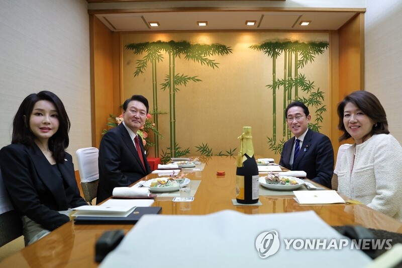 | 1박2일간의 일정으로 일본을 방문한 윤석열 대통령과 김건희 여사가 기시다 후미오 일본 총리 부부와 3월 16일 도쿄 긴자의 한 스키야키·샤부샤부 전문점에서 만찬을 하고 있다. 2023.3.16. / 사진=연합뉴스 |