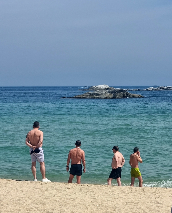 갑자기 여름 강릉 경포 - 지난달 28일 오전 강원 강릉지역 기온이 25도를 훌쩍 넘는 무더운 날씨를 보인 가운데 외국인들이 경포해수욕장에서 일광욕을 하거나 물놀이를 즐기고 있다. 2023.4.28 연합뉴스 |