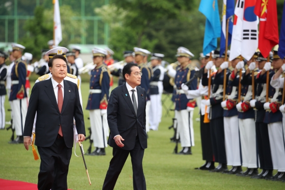 의장대 사열하는 한일 정상 - 윤석열 대통령이 1박2일 일정으로 한국을 방문한 기시다 후미오 일본 총리와 7일 서울 용산 대통령실에서 열린 공식 환영식에서 의장대를 사열하고 있다. 2023.5.7 연합뉴스 |