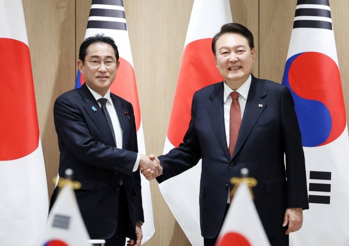 윤석열 대통령과 기시다 후미오 일본 총리가 7일 서울 용산 대통령실 청사에서 열린 확대 회담에서 악수하고 있다. /사진=뉴시스 |