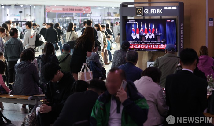 [서울=뉴스핌] 김학선 기자 = 윤석열 대통령과 기시다 후미오 일본 총리의 한일정상회담이 열린 7일 오후 서울역 대합실에서 시민들이 한일 정상 공동기자회견을 시청하고 있다. 2023.05.07 yooksa@newspim.com