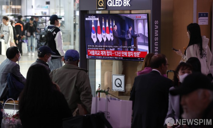 [서울=뉴스핌] 김학선 기자 = 윤석열 대통령과 기시다 후미오 일본 총리의 한일정상회담이 열린 7일 오후 서울역 대합실에서 시민들이 한일 정상 공동기자회견을 시청하고 있다. 2023.05.07 yooksa@newspim.com