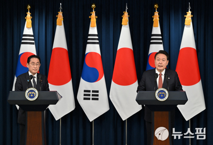 이와 관련해 윤 대통령은 회견문에서도 "지난해년 11월 프놈펜 한·미·일 3국 정상회담에서 합의된 북한 미사일 경보 정보의 실시간 공유와 관련해서 실현 방안에 대해 당국간 논의가 진행되고 있음을 환영하고, 앞으로도 한·미·일 3국간 안보협력을 이어 나가기로 했다"고 덧붙였다.