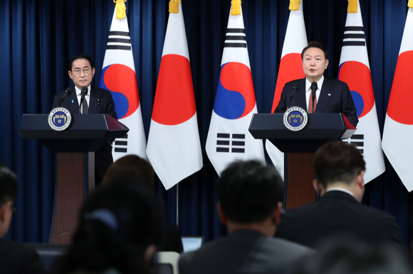 윤석열 대통령과 기시다 후미오 일본 총리가 7일 서울 용산 대통령실 청사에서 공동기자회견을 하고 있다. 2023.05.07. [사진=뉴시스] |