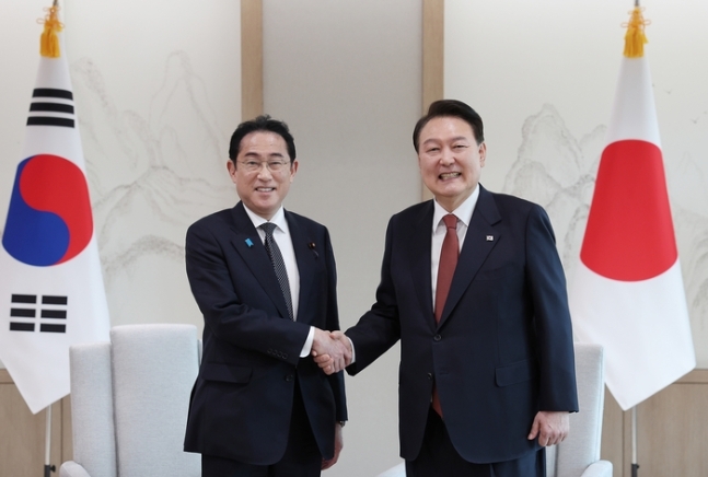 윤석열 대통령(오른쪽)과 기시다 후미오 일본 총리가 7일 서울 용산 대통령실 청사에서 열린 한·일 정상 소인수 회담에서 악수하고 있다. 연합뉴스 |