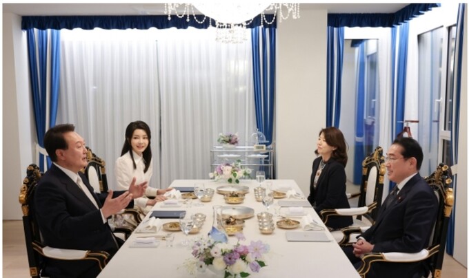 윤석열 대통령과 기시다 후미오(岸田文雄) 총리가 7일 한일 정상회담 뒤 부부 동반으로 만찬을 하며 친교를 다졌다.