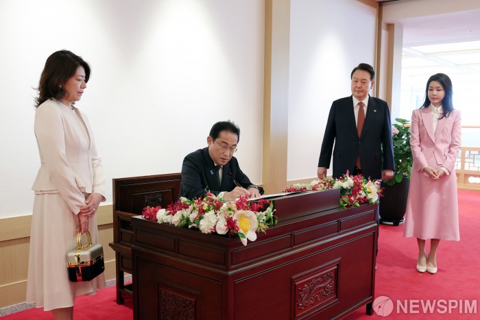 [서울=뉴스핌] 윤석열 대통령이 7일 용산 대통령실 청사에서 기시다 후미오 일본 총리의 방명록 작성을 바라보고 있다. [사진=대통령실] 2023.05.07 photo@newspim.com