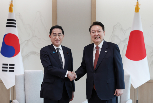 ▲윤석열 대통령과 기시다 후미오 일본 총리가 7일 서울 용산 대통령실 청사에서 열린 한일 정상 소인수 회담에서 악수하고 있다. ⓒ연합뉴스 |