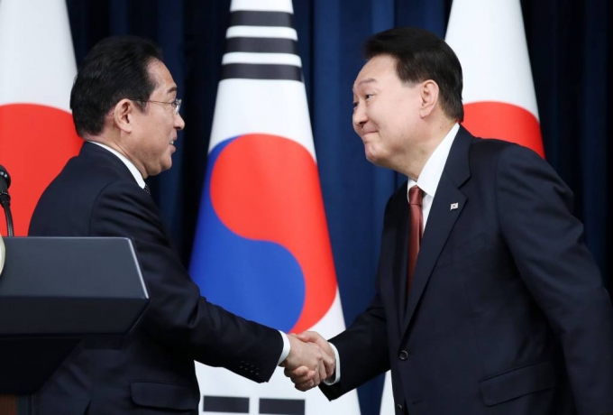 윤석열 대통령과 기시다 후미오 일본 총리가 7일 서울 용산 대통령실 청사에서 공동기자회견을 마친 뒤 악수하고 있다. /사진=뉴시스 |