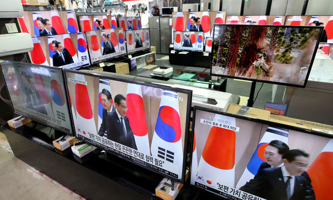 지난 7일 서울 용산 전자랜드에서 텔레비전을 통해 윤석열 대통령과 기시다 후미오 일본 총리의 정상회담이 생중계 되고 있다. 뉴스1 |