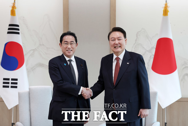 여야는 9일 기시다 후미오 일본 총리의 강제동원 피해자 발언을 두고 공방을 벌였다. 윤석열 대통령(오른쪽)과 기시다 총리가 지난 7일 대통령실 청사에서 악수하고 있는 모습. /대통령실 제공 |