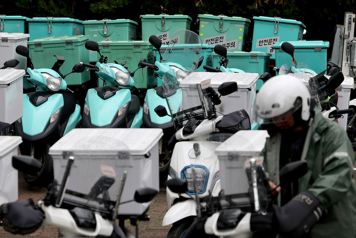 배달의민족 배달 기사 ‘배민 라이더’들이 단체교섭 최종 결렬에 따라 하루동안 파업을 개시한 지난 5일 오전 서울 강남구 우아한청년들 자회사 ‘딜리버리N’에 배달용 오토바이들이 줄줄이 주차되어 있다. 연합뉴스 |
