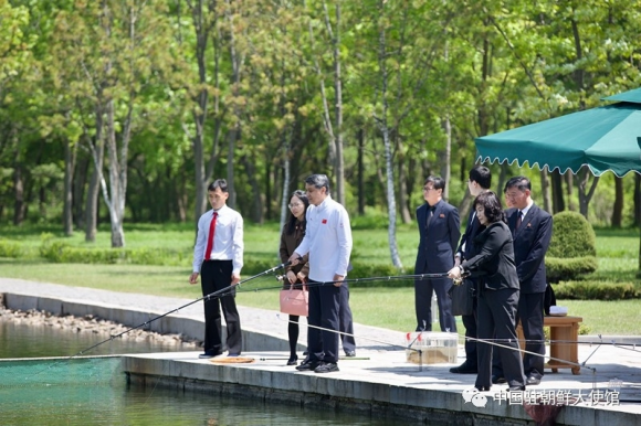 고방산 초대소에서 환영연회 전에 낚시하는 최선희(오른쪽) 북한 외무상과 왕야쥔(왼쪽 세번째) 주북 중국 대사. 중국 대사관 위챗 캡처 |