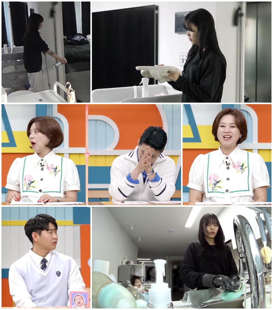 우선 김민정은 아침 일찍부터 일과표를 작성하고, 시간에 맞춰 이유식 먹이기, 청소하기 등을 부지런히 실행한다. 청소를 하기 전 슬리퍼 바닥까지 싹싹 닦은 김민정은 “더러운 슬리퍼로 바닥을 밟는 게 싫다”고 말한다. 이에 박미선은 “잔소리좌로서 할 말이 없으니 오늘은 집에 가야겠다”며 흐뭇해한다.