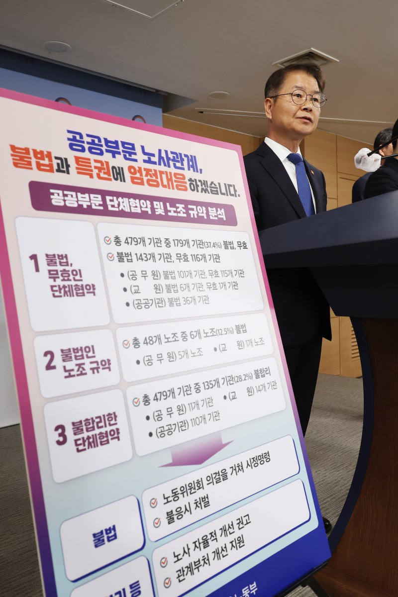 그러면서 "불법인 단체협약과 노조 규약에 대해서는 노동위원회 의결을 얻어 시정 명령하고 이에 불응하면 형사처벌할 계획"이라며 "불합리하거나 무효인 단체협약에 대해서는 노사가 자율적으로 개선하도록 권고·지원하겠다"고 밝혔다.