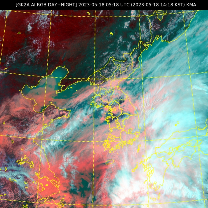 18일 오후 2시18분 기준 천리안2A위성이 관측한 한반도 RGB주야간합성(AI) 영상./사진=기상청 날씨누리 제공 |