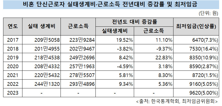 19일 한국통계학회가 최저임금위원회로부터 연구용역을 받아 작성한 ‘비혼 단신근로자 실태생계비 분석 보고서’에 따르면, 지난해 비혼 단신근로자의 월평균 실태생계비가 전년(220만5432원)보다 9.34% 급증한 241만1320원으로 조사됐다. 생계비는 9%이상 올랐지만, 근로소득은 전년보다 5.36% 오른 293만4896원에 그쳤다. 최임위는 최저임금을 결정하기 위해 생계비를 볼 때 비혼 단신근로자의 생계비를 따진다. 노동계는 4인 가족을 기준으로 한 생계비를 적용해야 한다고 주장하지만, 최저임금의 직접적인 대상이 될 가능성이 높은 노동시장 최초 진입계층을 기준으로 해야한다는 이유에서다.