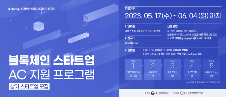 부산창조경제혁신센터(센터장 송용준, 이하 부산창경)는 블록체인 기술을 활용하고 있거나 활용 할 계획인 스타트업 액셀러레이팅 지원 프로그램인 ‘B.Startup 블록체인 액셀러레이팅 프로그램’ 참여 스타트업을 오는 6월 4일 까지 모집한다고 19일 밝혔다.