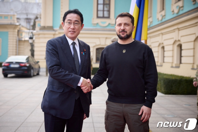기시다 후미오 일본 총리(왼쪽) 3월 21일(현지시간) 우크라이나 키이우를 깜짝 방문해 볼로디미르 젤렌스키 우크라이나 대통령과 악수를 하고 있다. /로이터=뉴스1 |