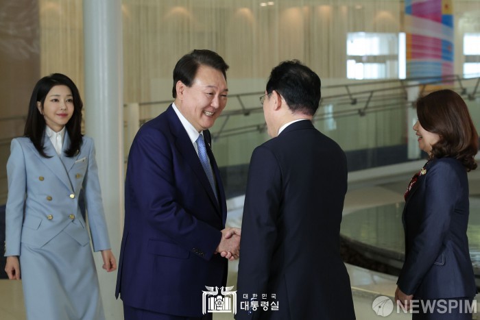 [서울=뉴스핌] 윤석열 대통령이 20일 히로시마 G7 정상회의장에서 열린 G7 정상회의 초청국 환영행사에 참석해 기시다 후미오 일본 총리와 악수하고 있다. [사진=대통령실] 2023.05.20 photo@newspim.com