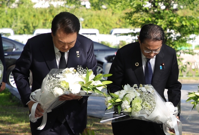 이날 오전 윤 대통령과 기시다 총리는 한인 원폭 희생자 위령비를 찾았다. 김건희 여사와 기시다 유코 여사도 동행했다.