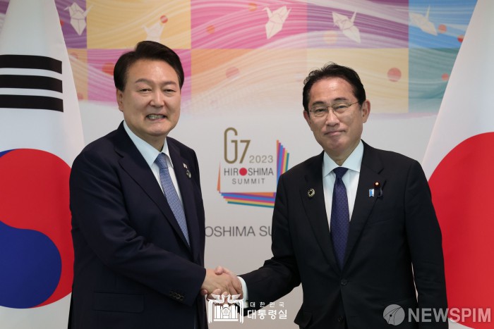 [서울=뉴스핌] 윤석열 대통령이 21일 히로시마 평화기념공원 국제회의장에서 열린 한일 정상회담에서 기시다 후미오 일본 총리와 악수하고 있다. [사진=대통령실] 2023.05.21 photo@newspim.com