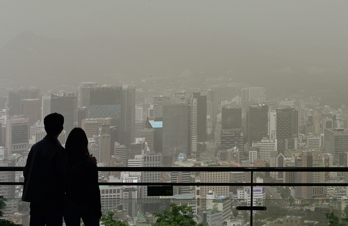 서울 남산에서 바라본 도심이 황사와 미세먼지로 뿌옇게 보이고 있다. [이충우 기자] |