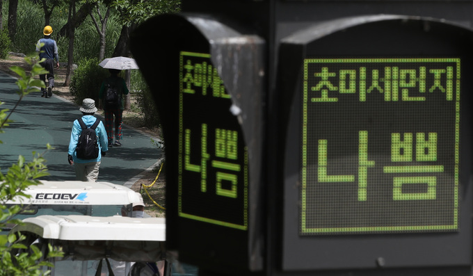 미세먼지주의보 속 산책하는 시민 22일 오후 서울 송파구 성내천에서 시민들이 산책하고 있다. 환경부 국립환경과학원은 이날 미세먼지 수준을 전남 ‘매우나쁨’, 수도권·강원권·충청권·광주·전북·영남권·제주권 ‘나쁨’으로 예보했다. 환경과학원은 이날 오후 2시를 기해 서울에 미세먼지주의보가 발령됐다고 전했다. 뉴스1 |