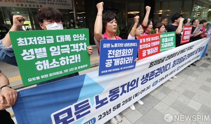 [서울=뉴스핌] 김학선 기자 = 모두를 위한 최저임금, 1만2천원 운동본부 관계자들이 25일 서울 중구 고용노동부 서울지방고용노동청 앞에서 최저임금위원회 전원회의 공개 촉구 기자회견을 하고 있다. 2023.05.25 yooksa@newspim.com