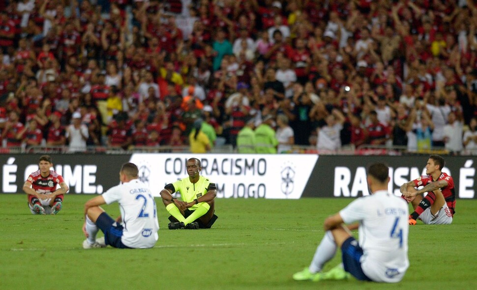 27일(현지시각) 브라질 리우데자네이루의 마라카나 경기장에서 열린 2023 브라질 챔피언십 경기 시작에 앞서 경기 심판 루이스 플라비우 데 올리베이라가 플라멩구와 크루제이루 선수들 사이에 앉아 브라질 축구 선수 비니시우스를 지지하는 연좌시위를 하고 있다. AFP 연합뉴스 |