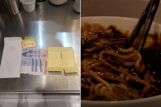 아이들에게 공짜로 음식을 더 건넨 인천 연수구 음식점 사장에게 아이가 나중에 두고 간 돈과 편지. 오른쪽은 기사와 직접적인 관련 없는 자장면 자료사진. 〈사진=음식점 사장 A씨 측 제공(좌), JTBC 캡처(우)〉 |