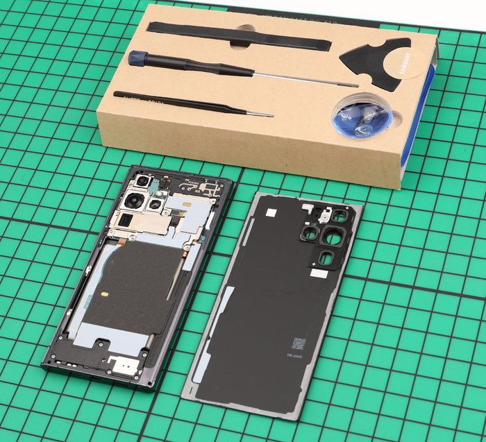 갤럭시 자가 수리 도구와 갤럭시 S22 울트라 제품 사진 |